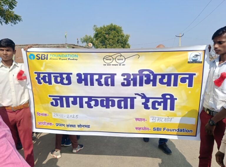 On 27th November 2025, Prayatn Sanstha, under the SBI Sanjeevani – Clinic on Wheels initiative supported by the SBI Foundation, organized a Swachhata Rally and Cleanliness Awareness Programme in Suarasot village of Nagwa block, Sonbhadra district, Uttar Pradesh, as part of the Swachh Bharat Abhiyan.