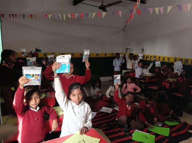 As an encouragement, one boy and one girl from each class, selected from all three schools for their participation in drawing and cultural activities, received winter caps, lunch boxes and pens.